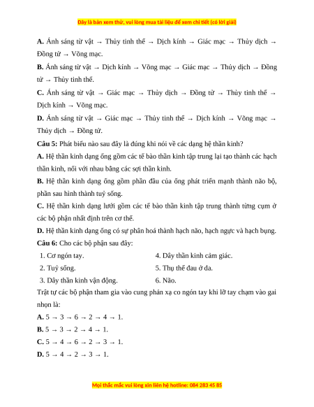 Câu 4: Con đường thu nhận ánh sáng ở mắt diễn ra theo sơ đồ nào dưới đây?