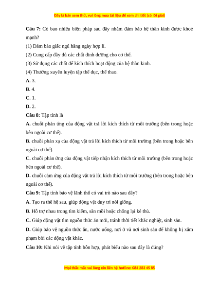 Câu 9: Tập tính bảo vệ lãnh thổ có vai trò nào sau đây?