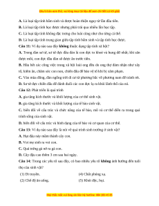 Câu 14: Trong các yếu tố sau đây, có bao nhiêu yếu tố không ảnh hưởng đến tuổi thọ của sinh vật? (1) Di truyền. (4) Chất phóng xạ. (2) Chế độ ăn uống. (5) Khói độc, bụi.