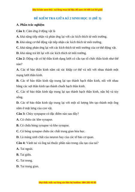 ĐỀ KIỂM TRA GIỮA KÌ 2 SINH HỌC 11 (ĐỀ 3)