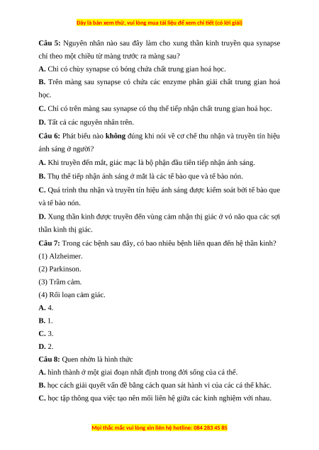 Câu 7: Trong các bệnh sau đây, có bao nhiêu bệnh liên quan đến hệ thần kinh? (1) Alzheimer. (2) Parkinson. (3) Trầm cảm. (4) Rối loạn cảm giác. A. 4. B. 1. C. 3. D. 2.