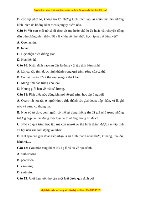 Câu 12: Con mèo tăng thêm 0,5 kg là ví dụ về quá trình A. sinh trưởng. B. phát triển. C. cảm ứng. D. sinh sản.