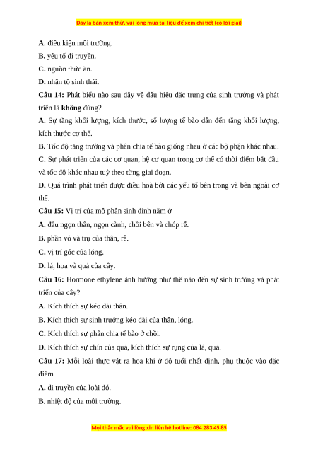 Câu 14: Phát biểu nào sau đây về dấu hiệu đặc trưng của sinh trưởng và phát