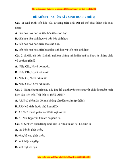 ĐỀ KIỂM TRA GIỮA KÌ 2 SINH HỌC 12 (ĐỀ 2)