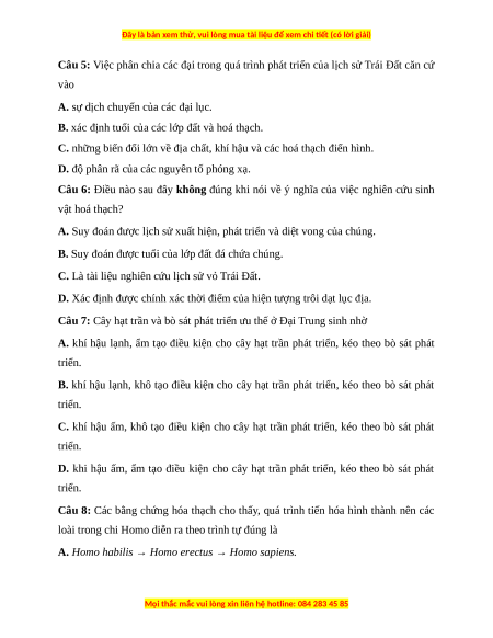 Câu 5: Việc phân chia các đại trong quá trình phát triển của lịch sử Trái Đất căn cứ vào