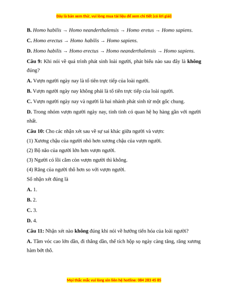 Câu 11: Nhận xét nào không đúng khi nói về hướng tiến hóa của loài người?