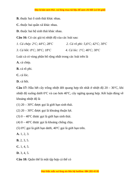 Câu 14: Khoảng chống chịu là khoảng của các nhân tố sinh thái