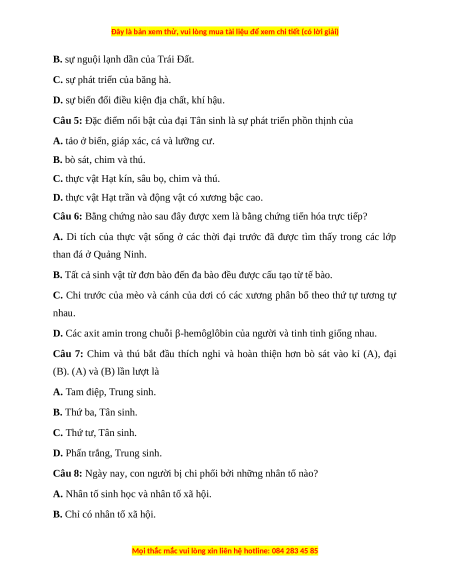 Câu 5: Đặc điểm nổi bật của đại Tân sinh là sự phát triển phồn thịnh của