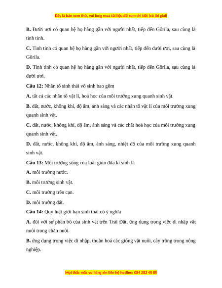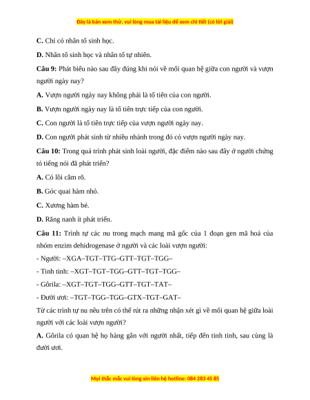 Câu 9: Phát biểu nào sau đây đúng khi nói về mối quan hệ giữa con người và vượn người ngày nay?