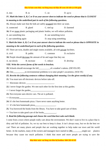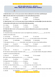 - IV. Mark the letter A, B, C or D on your answer sheet to indicate the word or phrase that is CLOSEST in meaning to the underlined part in each of the following questions.