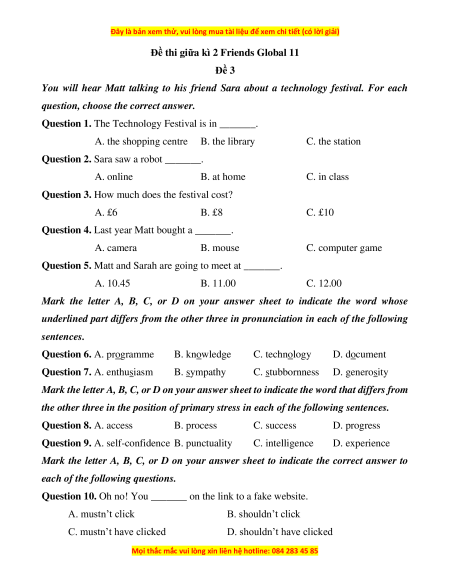 Đề thi giữa kì 2 Tiếng Anh 11 Friends global (Đề 3 kèm file nghe)