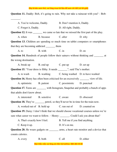 Question 11. Daddy: Bob, it’s going to rain. Why not take a raincoat with you? - Bob: _______. A. You’re welcome, Daddy. B. Don’t mention it, Daddy. C. Forget it, Daddy. D. All right, Daddy.