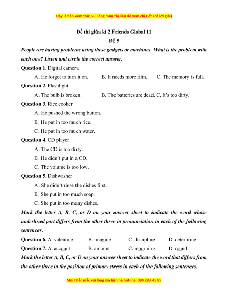Đề thi giữa kì 2 Tiếng Anh 11 Friends global (Đề 5 kèm file nghe)