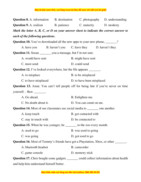 Question 11. Susan _______ you a message, but I’m not sure. A. would have sent B. might have sent C. must send D. could send