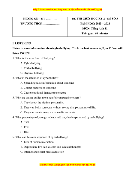 Đề thi giữa kì 2 Tiếng Anh 11 Global success (Đề 3 kèm file nghe)