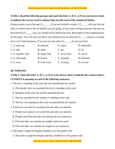 else is in T-shirt and jeans. If you are not sure what (5)_____, do ask your host. 1. A. enjoying B. enjoyed C. enjoy D. enjoyable 2. A. take B. make C. get D. do 3. A. together with B. along with C. away from D. out of 4. A. informally B. formal C. formally D. informal 5. A. wear B. to be worn C. wearing D. to wear III. WRITING