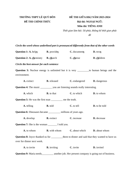 Đề thi giữa kì 2 Tiếng Anh 11 trường THPT Lê Quý Đôn
