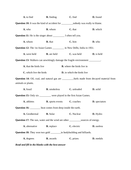Question 10: It was the kind of accident for _________nobody was really to blame. A. who B. whom C. that D. which