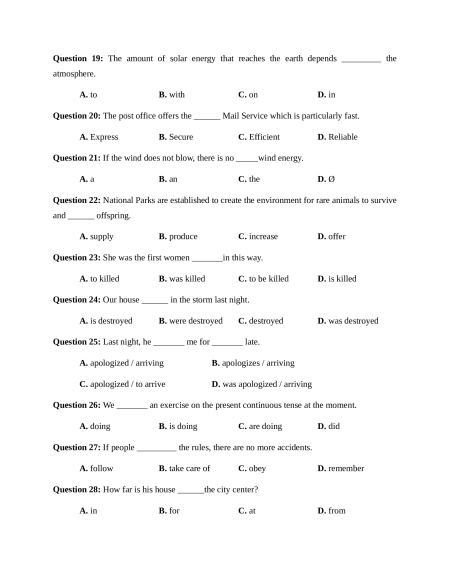 Question 19: The amount of solar energy that reaches the earth depends _________ the atmosphere. A. to B. with C. on D. in