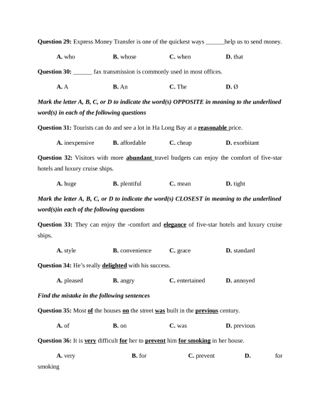 Question 20: The post office offers the ______ Mail Service which is particularly fast. A. Express B. Secure C. Efficient D. Reliable