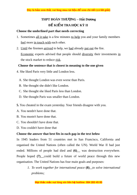 Đây là bản xem th , vu ử i lòng mua tài li u ệ đ xe ể m chi ti t ế (có l i ờ gi i ả ) THPT ĐOÀN THƯ N Ợ G – H i ả Dư ng ơ ĐỀ KIỂM TRA H C Ọ KỲ II