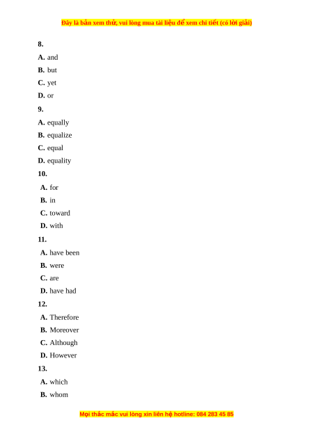 Đây là bản xem th , vu ử i lòng mua tài li u ệ đ xe ể m chi ti t ế (có l i ờ gi i ả ) 8. A. and B. but C. yet D. or 9. A. equally B. equalize C. equal D. equality 10. A. for B. in C. toward D. with 11. A. have been B. were C. are D. have had 12. A. Therefore B. Moreover C. Although D. However 13. A. which B. whom M i ọ th c ắ m c