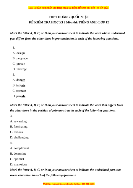 part differs from the other three in pronunciation in each of the following questions. 1. A. design B. persuade C. pursue D. increase 2. A. donate B. imitate C. operate D. private