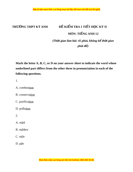 underlined part differs from the other three in pronunciation in each of the following questions. 1. A. combustion B. conservation C. purification D. pollution 2. A. mild B. mildew C. mile D. pile