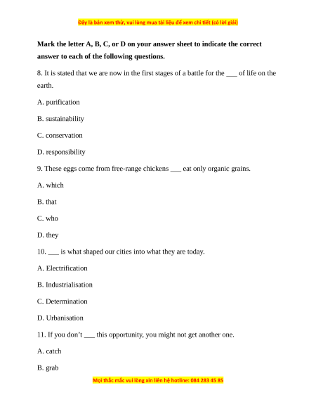 8. It is stated that we are now in the first stages of a battle for the ___ of life on the earth. A. purification B. sustainability C. conservation D. responsibility