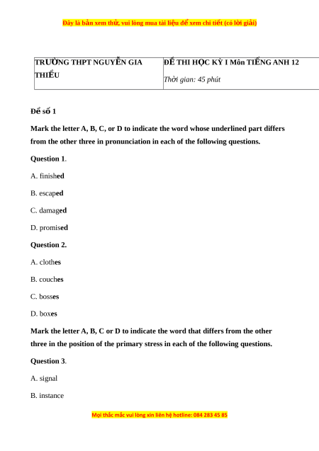 Đây là bản xem th , vu ử i lòng mua tài li u ệ đ xe ể m chi ti t ế (có l i ờ gi i ả ) TRƯ N Ờ G THPT NGUY N Ễ GIA ĐỀ THI H C Ọ KỲ I Môn TI N Ế G ANH 12 THIỀU Th i ờ gian: 45 phút Đ s ề 1 ố