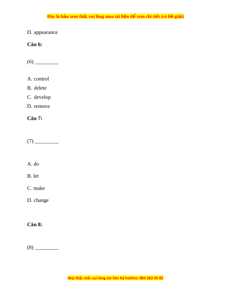 Đây là bản xem th , vu ử i lòng mua tài li u ệ đ xe ể m chi ti t (c ế ó l i ờ gi i ả ) D. appearance Câu 6: (6) _________ A. control B. delete C. develop D. remove Câu 7: (7) _________ A. do B. let C. make D. change Câu 8: (8) _________