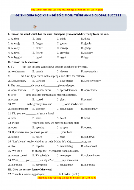 ĐỀ THI GIỮA HỌC KÌ 2 – ĐỀ SỐ 2 MÔN: TIẾNG ANH 6 GLOBAL SUCCESS