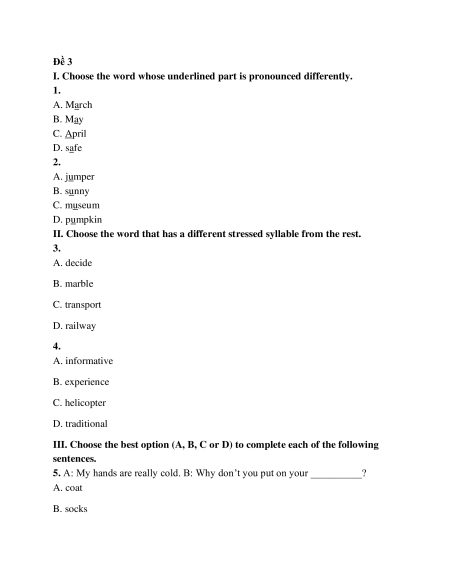 II. Choose the word that has a different stressed syllable from the rest. 3. A. decide B. marble C. transport D. railway 4. A. informative B. experience C. helicopter D. traditional