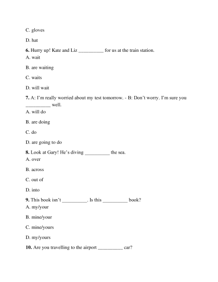 6. Hurry up! Kate and Liz __________ for us at the train station. A. wait B. are waiting C. waits D. will wait