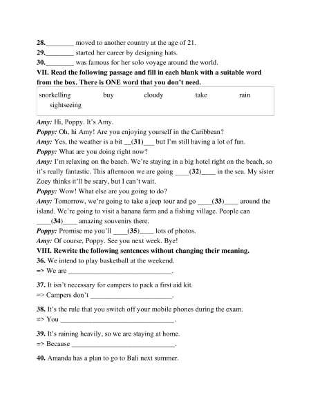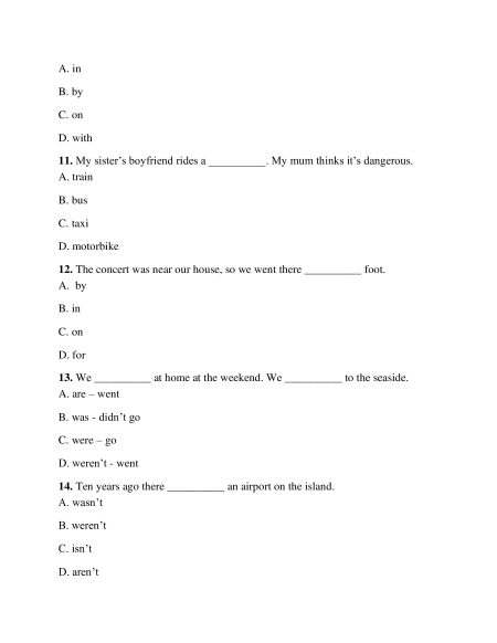 11. My sister’s boyfriend rides a __________. My mum thinks it’s dangerous. A. train B. bus C. taxi D. motorbike
