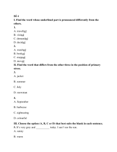 II. Find the word that differs from the other three in the position of primary stress. 3. A. jacket B. summer C. July D. snowman 4. A. September B. barbecue C. sightseeing D. colourful
