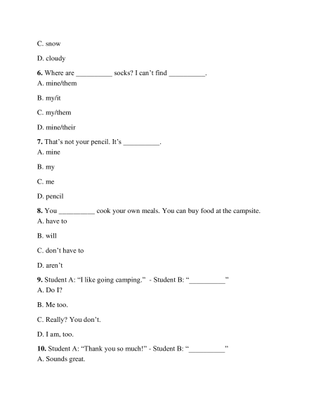 9. Student A: “I like going camping.” - Student B: “__________” A. Do I? B. Me too. C. Really? You don’t. D. I am, too.