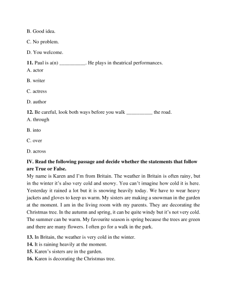 11. Paul is a(n) __________. He plays in theatrical performances. A. actor B. writer C. actress D. author