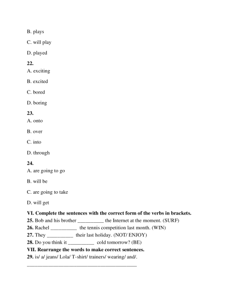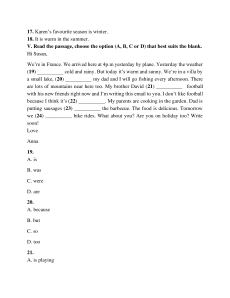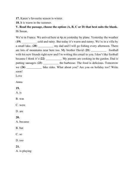 we (24) __________ bike rides. What about you? Are you on holiday too? Write soon! Love Anna 19. A. is B. was C. were D. are 20. A. because B. but C. so D. too 21. A. is playing