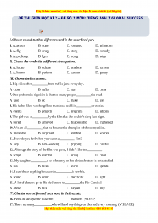 ĐỀ THI GIỮA HỌC KÌ 2 – ĐỀ SỐ 2 MÔN: TIẾNG ANH 7 GLOBAL SUCCESS