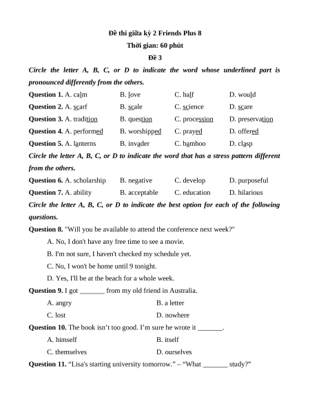 Đề thi giữa kỳ 2 Friends Plus 8 Thời gian: 60 phút Đề 3