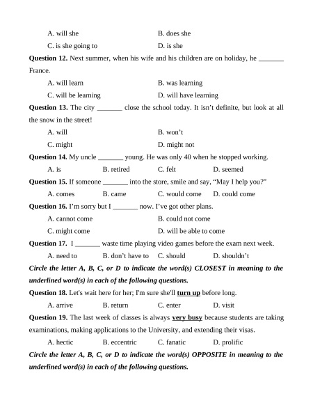Question 12. Next summer, when his wife and his children are on holiday, he _______ France. A. will learn B. was learning C. will be learning D. will have learning