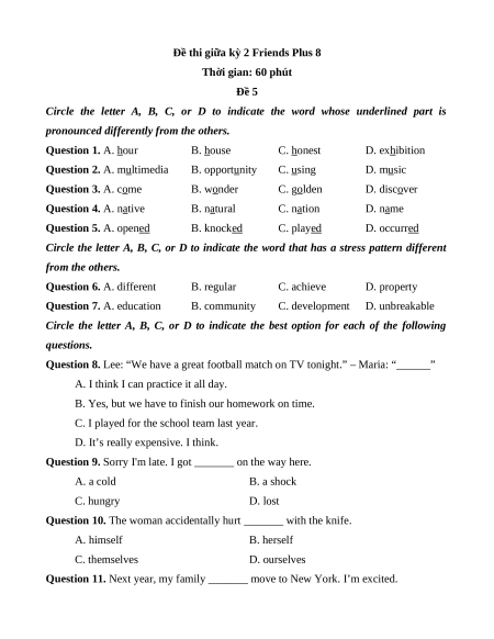 Đề thi giữa kì 2 Tiếng Anh 8 Friends Plus (Đề 5)