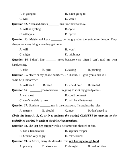 Question 16. I _______ you tomorrow. I’m going to visit my grandparents. A. can meet B. could not meet C. won’t be able to meet D. will be able to meet