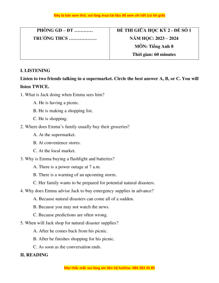 Đề thi giữa kì 2 Tiếng Anh 8 Global success (Đề 1 kèm file nghe)