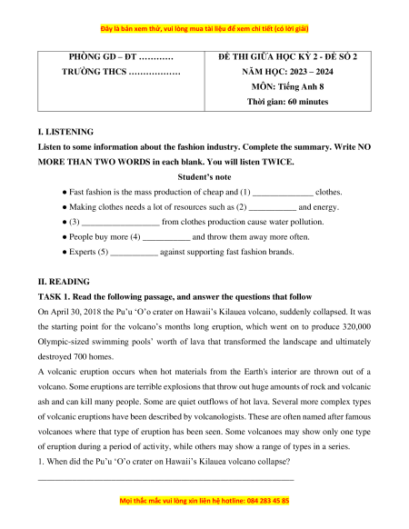 Đề thi giữa kì 2 Tiếng Anh 8 Global success (Đề 2 kèm file nghe)