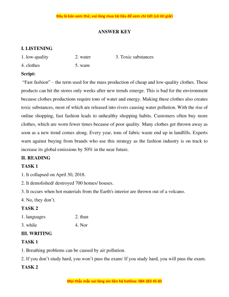 ANSWER KEY I. LISTENING 1. low-quality 2. water 3. Toxic substances 4. clothes 5. warn Script: