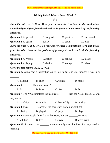 Đề thi giữa kì 2 Tiếng Anh 8 ilearn smart world (Đề 1)