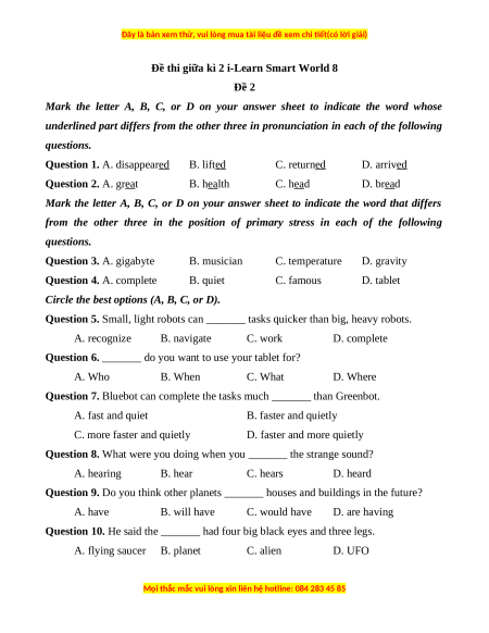 Đề thi giữa kì 2 Tiếng Anh 8 ilearn smart world (Đề 2)