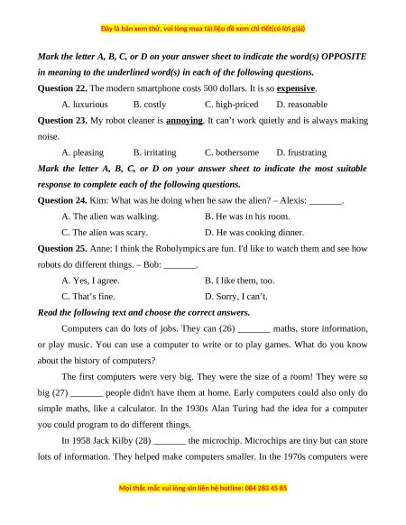 Question 22. The modern smartphone costs 500 dollars. It is so expensive. A. luxurious B. costly C. high-priced D. reasonable